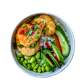 Riz vinaigré, edamame, oignons frits, ananas, poulet, coriandre, radis, avocat, sauce sucrée, sésame, carotte.